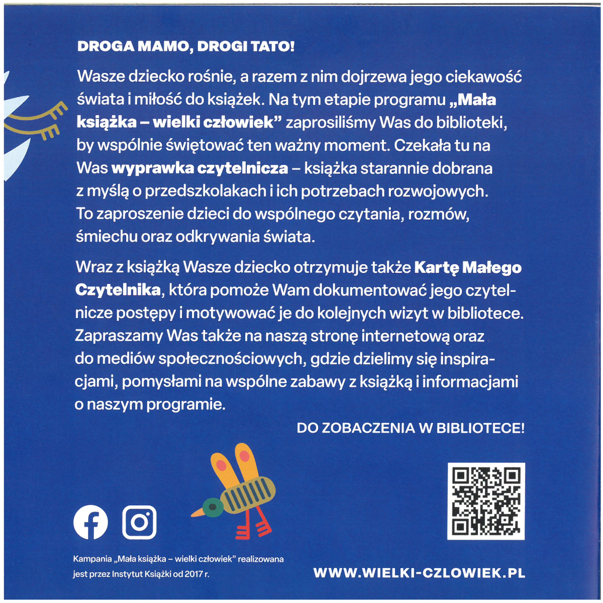 W ramach programu „Mała książka – wielki człowiek”, który jest realizowany przez Instytut Książki, od lat do rąk dzieci i ich opiekunów trafiają bezpłatne wyprawki czytelnicze. Jesteśmy jedną z blisko 7 000 bibliotek publicznych w Polsce, w której dzieci w wieku przedszkolnym mogą odbierać wyjątkowe książki na dobry czytelniczy start.